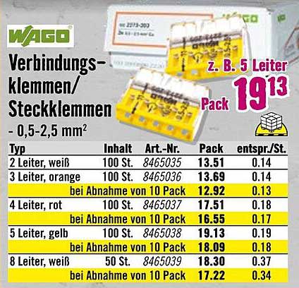Aktuell bieten wir Ihnen die WAGO Verbindungen zu einem unschlagbaren Preis von 19,13 € pro Packung an. Im Vergleich zum Normalpreis handelt es sich hierbei um eine erhebliche Ersparnis. Kaufen Sie mehrere Packs oder größere Mengen und profitieren Sie von noch günstigeren Preisen, wie beispielsweise 12,99 € pro Pack bei Abnahme von 10 Packs.