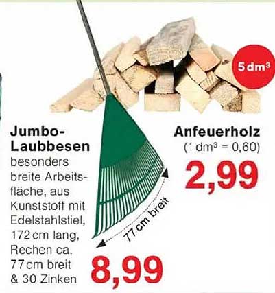 Der Jumbo-Laubbesen ist für nur 8,99 € erhältlich, was im Vergleich zum regulären Preis eine erhebliche Ersparnis darstellt. Diese Qualität und Funktionalität zu diesem Preis sind kaum zu schlagen. Das Anfeuerholz ist mit einem unschlagbaren Preis von nur 2,99 € ebenfalls ein hervorragendes Angebot. Wenn du die vorherigen Preise berücksichtigst, siehst du sofort, wie viel du hier sparen kannst.