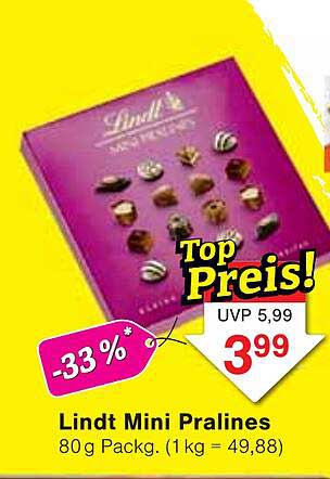 Der aktuelle Angebotspreis für die Lindt Mini Pralines liegt bei nur 3,99 €, im Vergleich zum regulären Preis von 5,99 €. Dies entspricht einer Ersparnis von 33 %, die es zu einem unschlagbaren Preis-Leistungs-Verhältnis macht. Gönnen Sie sich dieses süße Vergnügen, solange der Vorrat reicht!