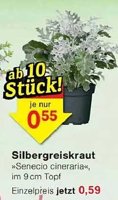 Sehen Sie sich jetzt das Silbergreiskraut »Senecio cineraria«, im 9 cm Topf Angebot im Jawoll Prospekt an. Dieses Angebot ist gültig von 22.09.2025 bis 27.09.2025.