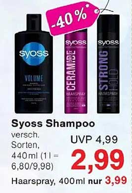 Die Syoss Produkte bieten nicht nur hervorragende Ergebnisse, sie sind auch einfach in der Anwendung. Sie sorgen für glänzendes, gesundes Haar und schützen es vor schädlichen Umwelteinflüssen. Dank der praktischen Größen von 440ml sind die Shampoos und Haarsprays ideal für die tägliche Anwendung. Egal, ob für zu Hause oder für unterwegs – Syoss ist Ihre perfekte Wahl.