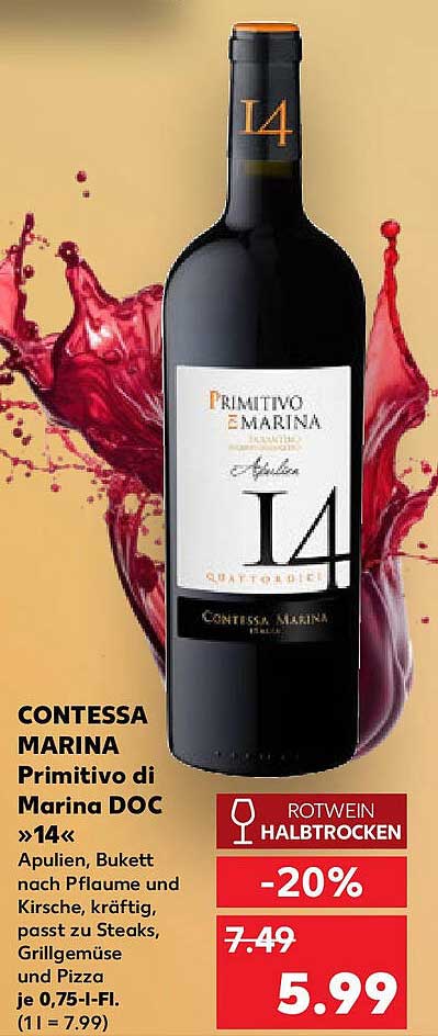 Der ursprüngliche Preis des CONTESSA MARINA Primitivo beträgt 7,49 €. Durch die aktuelle Aktion profitieren Sie von einer Ersparnis von 20%, sodass Sie den Wein nun für nur 5,99 € erhalten. Ein tolles Angebot, das sowohl den Geldbeutel schont als auch den Gaumen verwöhnt.