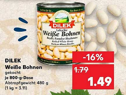 Aktuell erhalten Sie die DILEK Weiße Bohnen zum Preis von nur 1,49 €, anstelle des regulären Preises von 1,79 € – das bedeutet eine attraktive Ersparnis von 16%! Vergleichen Sie das mit anderen Anbietern und überzeugen Sie sich selbst, wie viel Sie hier sparen können. Dieses Angebot ist nicht nur vorteilhaft für Ihren Geldbeutel, sondern auch für Ihre Küche!
