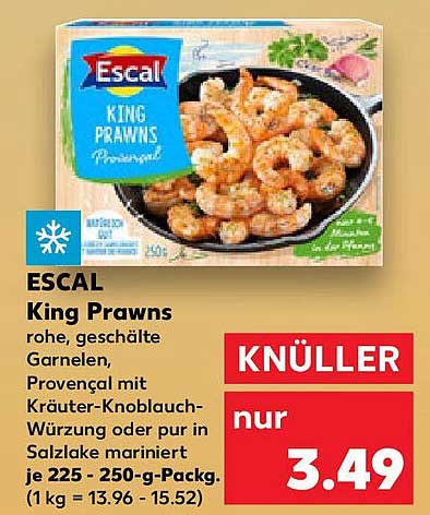 Sehen Sie sich jetzt das ESCAL King Prawns – Rohe, geschälte Garnelen in verschiedenen Variationen Angebot im Kaufland Prospekt an. Dieses Angebot ist gültig von 09.10.2025 bis 15.10.2025.