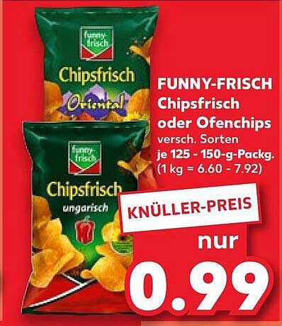 Sehen Sie sich jetzt das FUNNY-FRISCH Chipsfrisch oder Ofenchips 125-150 g Angebot im Kaufland Prospekt an. Dieses Angebot ist gültig von 17.09.2025 bis 17.09.2025.
