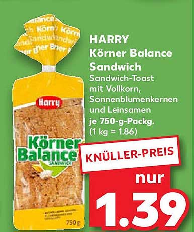 Sehen Sie sich jetzt das HARRY Körner Balance Sandwich - Sandwich-Toast mit Vollkorn, Sonnenblumenkernen und Leinsamen Angebot im Kaufland Prospekt an. Dieses Angebot ist gültig von 12.10.2025 bis 15.10.2025.