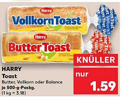 Sehen Sie sich jetzt das Harry Toast Butter, Vollkorn oder Balance je 500-g-Pack. Angebot im Kaufland Prospekt an. Dieses Angebot ist gültig von 09.04.2025 bis 16.04.2025.