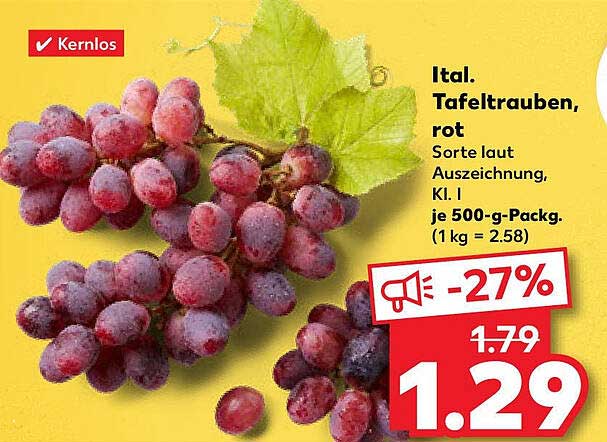 Sehen Sie sich jetzt das Ital. Tafeltrauben, rot (500 g) Angebot im Kaufland Prospekt an. Dieses Angebot ist gültig von 09.10.2025 bis 15.10.2025.