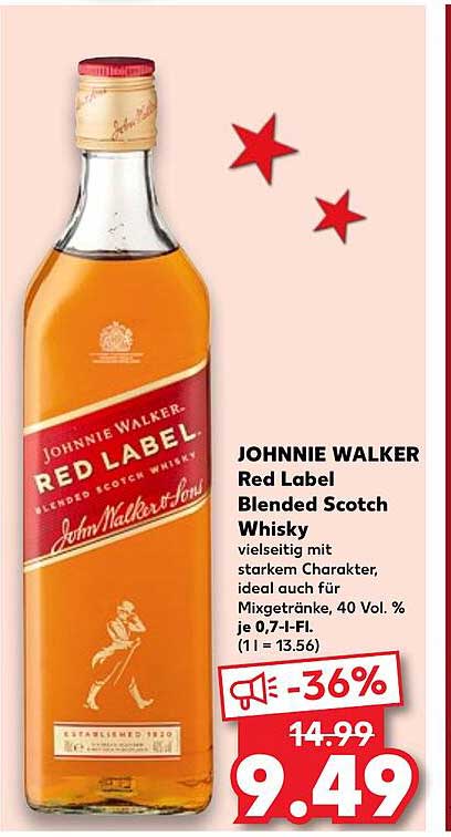 Sehen Sie sich das Johnnie Walker Red Label Blended Scotch Whisky Angebot bei Kaufland an! Dieses fantastische Angebot ist jetzt im neuesten Kaufland Prospekt verfügbar. Nutzen Sie diese Chance und sparen Sie viel bei Ihrem Einkauf.