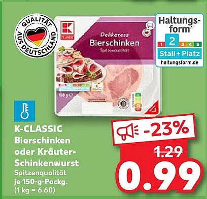 Entdecken Sie die leckeren K-CLASSIC Bierschinken und Kräutershinkenwurst, die nicht nur geschmacklich überzeugen, sondern auch in der Qualität höchste Ansprüche erfüllen. Dieses Angebot gilt nur für kurze Zeit und stellt eine hervorragende Möglichkeit dar, sich eine Delikatesse zum kleinen Preis zu sichern.
