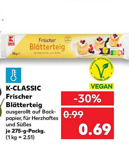 Aktuell erhalten Sie den K-CLASSIC Frischen Blätterteig zum Aktionspreis von nur 0,69 €. Im Vergleich zum Normalpreis von 0,99 € ergibt sich eine Ersparnis von 30%. Dies macht ihn zu einem unschlagbaren Angebot, das Sie sich nicht entgehen lassen sollten.