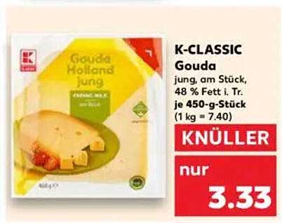 Sehen Sie sich jetzt das K-CLASSIC Gouda jung, am Stück, 48 % Fett i. Tr. je 450-g-Stück Angebot im Kaufland Prospekt an. Dieses Angebot ist gültig von 27.03.2025 bis 02.04.2025.