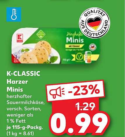 Im aktuellen Kaufland-Prospekt sind die K-CLASSIC Harzer Minis jetzt für nur 0,99 € erhältlich - ein Preisnachlass von 23 % gegenüber dem regulären Preis von 1,29 €. Dies bedeutet nicht nur eine Ersparnis für Ihren Geldbeutel, sondern auch die Möglichkeit, in den Genuss eines hochwertigen Produkts zu kommen, das in Ihrer Küche nicht fehlen sollte.