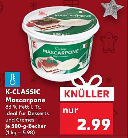 Sehen Sie sich das K-Classic Mascarpone Angebot bei Kaufland an! Dieses fantastische Angebot ist jetzt im neuesten Kaufland Prospekt verfügbar. Nutzen Sie diese Chance und sparen Sie viel bei Ihrem Einkauf.