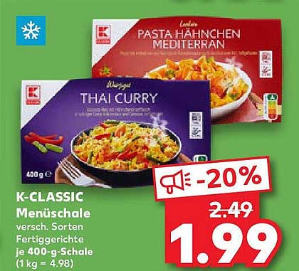 Sehen Sie sich jetzt das K-CLASSIC Menüschnitten - Thai Curry und Pasta Hähnchen Mediterran Angebot im Kaufland Prospekt an. Dieses Angebot ist gültig von 02.10.2025 bis 08.10.2025.