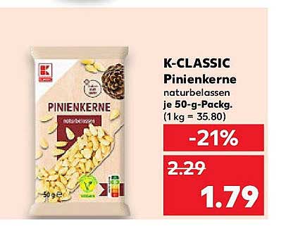 Sehen Sie sich das K-Classic Pinienkerne Angebot bei Kaufland an! Dieses fantastische Angebot ist jetzt im neuesten Kaufland Prospekt verfügbar. Nutzen Sie diese Chance und sparen Sie viel bei Ihrem Einkauf.