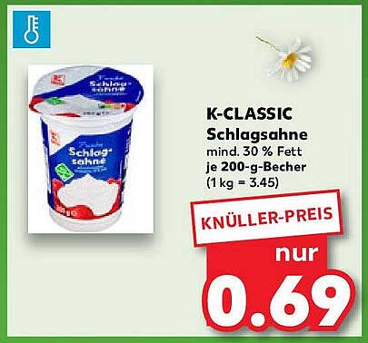 Sehen Sie sich jetzt das K-CLASSIC Schlagsahne 200-g-Becher Angebot im Kaufland Prospekt an. Dieses Angebot ist gültig von 09.04.2025 bis 16.04.2025.