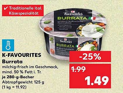 Profitieren Sie jetzt von einem attraktiven Angebot! Der normale Preis für die K-Favourites Burrata beträgt 1,99 €, doch aktuell zahlen Sie nur 1,49 €. Das entspricht einer Ersparnis von 25 % - ein hervorragendes Schnäppchen für solch einen hochwertigen Käse!
