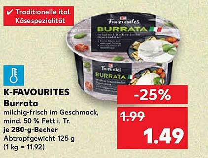 Sehen Sie sich jetzt das K-Favourites Burrata - Traditionelle ital. Käsespezialität Angebot im Kaufland Prospekt an. Dieses Angebot ist gültig von 09.04.2025 bis 16.04.2025.