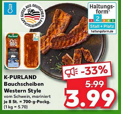 Entdecken Sie die köstlichen K-Purland Bauscheiben Western Style, die perfekt mariniert sind und für jeden Grillabend oder Familienessen eine wahre Geschmacksreise bieten. Mit einer Ersparnis von 33 % ist dieses Angebot nicht nur preiswert, sondern verschafft Ihnen auch die Möglichkeit, leckere Gerichte zu zaubern, die alle Ihre Gäste begeistern werden.