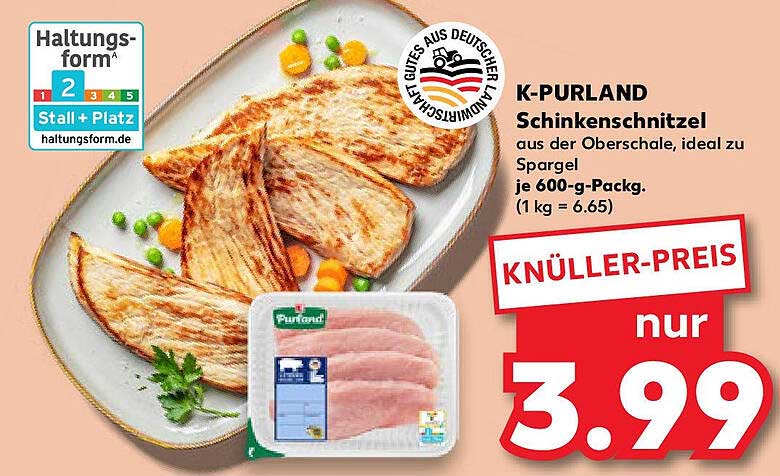 Sehen Sie sich jetzt das K-PURLAND Schinkenschnitzel aus der Oberschale, ideal zu Spargel Angebot im Kaufland Prospekt an. Dieses Angebot ist gültig von 23.04.2025 bis 30.04.2025.