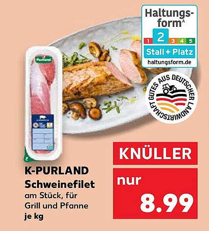 Das K-PURLAND Schweinefilet stammt aus deutscher Haltung und erfüllt höchste Qualitätsstandards. Mit einem Gewicht von je kg ist es ideal portionierbar und bietet Ihnen die Möglichkeit, genau die Menge zu wählen, die Sie benötigen. Außerdem garantiert das Siegel „Haltungsform“ hervorragende Bedingungen für die Tiere.