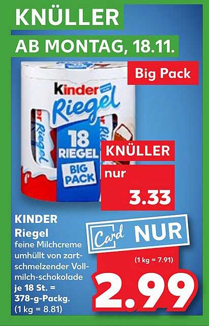 Sehen Sie sich jetzt das KINDER Riegel Angebot im Kaufland Prospekt an. Dieses Angebot ist gültig von 14.11.2024 bis 20.11.2024.