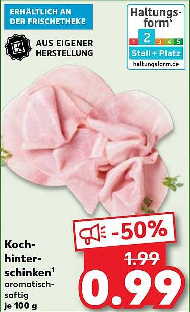 Mit einem sensationellen Preis von nur 0,99 € pro 100 g ist dieser Kochschinken um 50 % reduziert - vorher 1,99 €. Diese Ersparnis macht es einfach, hochwertige Lebensmittel ohne schlechtes Gewissen zu genießen. Nutzen Sie diese Gelegenheit, um Ihren Kühlschrank mit diesem köstlichen Produkt zu füllen und genaustens darauf zu achten, dass Sie keine extravaganten Preise zahlen müssen.