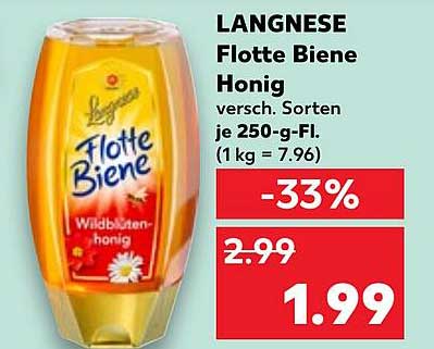 Mit einem aktuellen Preis von nur 1,99 € ist der LANGNESE Flotte Biene Honig um 33% reduziert – das sind nur 7,96 € pro Kilogramm! Im Vergleich zum regulären Preis von 2,99 € können Sie hier ordentlich sparen. Ein Grund mehr, dieses Angebot nicht zu verpassen!