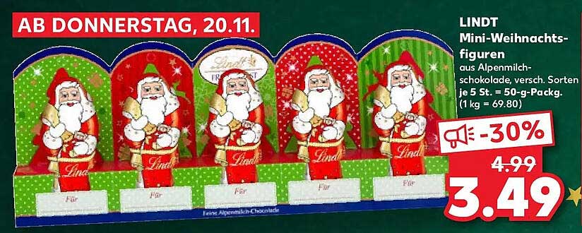 Sehen Sie sich jetzt das LINDT Mini-Weihnachtsfiguren aus Vollmilschokolade, 5 Stück, 50 g-Packung Angebot im Kaufland Prospekt an. Dieses Angebot ist gültig von 20.11.2025 bis 26.11.2025.