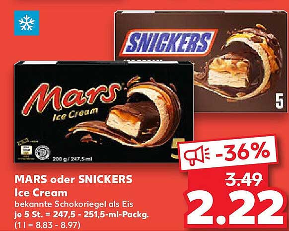 Im aktuellen Angebot erhalten Sie die MARS oder SNICKERS Ice Cream für nur 2,22 Euro, statt dem regulären Preis von 3,49 Euro. Das bedeutet eine Ersparnis von satten 36%! Nutzen Sie diese Chance, um sich und Ihren Lieben etwas ganz Besonderes zu gönnen.