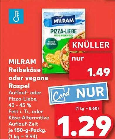 Sehen Sie sich jetzt das MILRAM Reibekäse oder vegane Raspel – Pizza-Liebe Angebot im Kaufland Prospekt an. Dieses Angebot ist gültig von 07.09.2025 bis 10.09.2025.