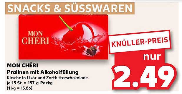 Die MON CHÉRI Pralinen kommen in einer praktischen Verpackung mit 15 Stück à 157 g. Mit einem Preis von nur 2,49 € pro Packung bleibt dieses Angebot unvergleichlich attraktiv. Bei einem Gesamtgewicht von 1 kg ergibt sich ein Preis von 15,86 €.