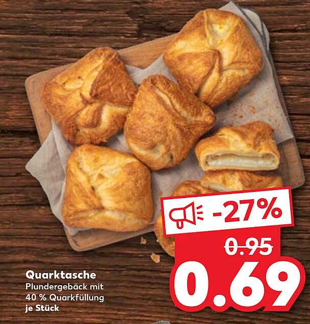 Der aktuelle Preis für die Quarktasche liegt bei nur 0,69 € pro Stück, was eine erstaunliche Ersparnis von 27 % im Vergleich zum Normalpreis von 0,95 € darstellt. Ein unschlagbares Angebot, bei dem Geschmack und Qualität zu einem überwältigenden Preis-Leistungs-Verhältnis zusammenkommen.