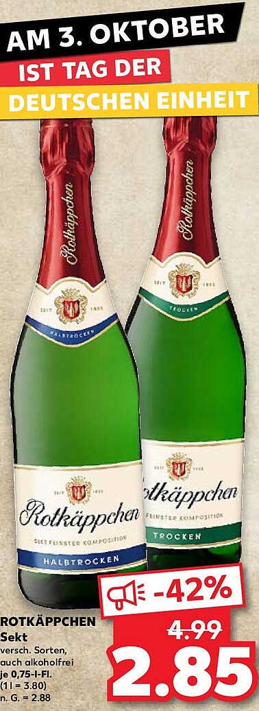 Sehen Sie sich das Rotkäppchen Sekt Angebot bei Kaufland an! Dieses fantastische Angebot ist jetzt im neuesten Kaufland Prospekt verfügbar. Nutzen Sie diese Chance und sparen Sie viel bei Ihrem Einkauf.