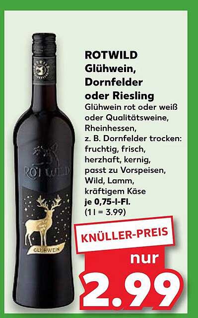 Sehen Sie sich jetzt das ROTWILD Glühwein, Dornfelder oder Riesling Angebot im Kaufland Prospekt an. Dieses Angebot ist gültig von 24.10.2024 bis 31.10.2024.