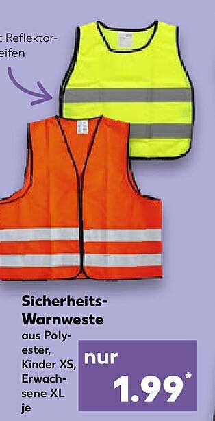 Sehen Sie sich jetzt das Sicherheits-Warnweste aus Polyester, Kinder XS, Erwachsene XL je Angebot im Kaufland Prospekt an. Dieses Angebot ist gültig von 09.10.2025 bis 15.10.2025.
