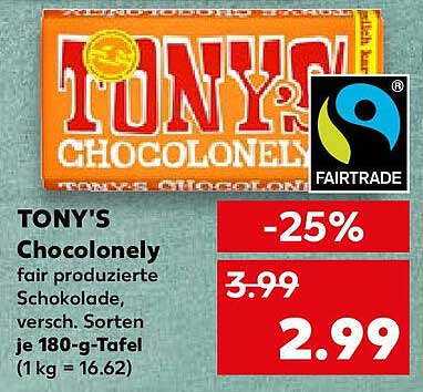 Sehen Sie sich jetzt das TONY'S Chocolonely – fair produzierte Schokolade, verschiedene Sorten Angebot im Kaufland Prospekt an. Dieses Angebot ist gültig von 14.08.2025 bis 20.08.2025.