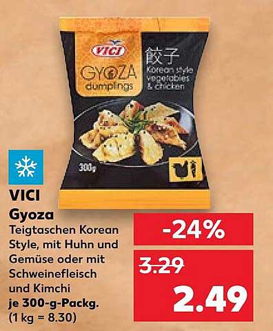 Sehen Sie sich jetzt das VICI Gyoza Teigtaschen Korean Style mit Huhn und Gemüse oder mit Schweinefleisch und Kimchi Angebot im Kaufland Prospekt an. Dieses Angebot ist gültig von 17.09.2025 bis 17.09.2025.