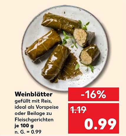 Entdecken Sie das großartige Weinblätter Angebot im neuesten Kaufland Prospekt. Neben diesem Angebot finden Sie noch viele weitere attraktive Rabatte. Sie können das Weinblätter einfach online über die Kaufland Website bestellen oder in einem Geschäft in Ihrer Nähe kaufen.