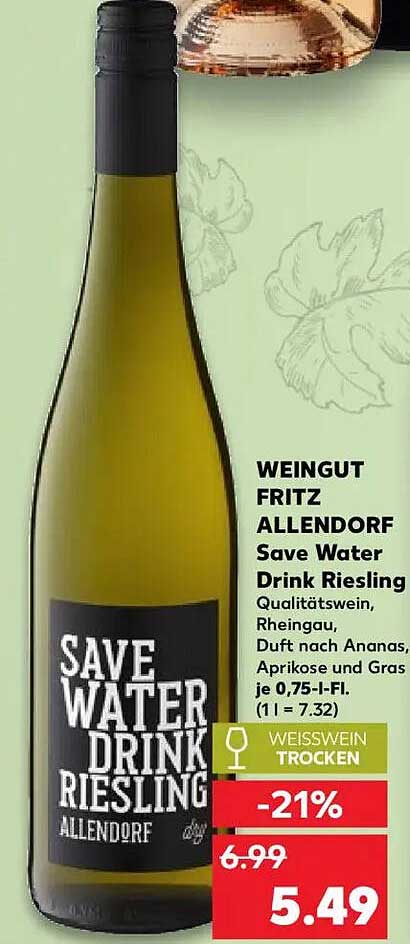 Sehen Sie sich jetzt das WEINGUT FRITZ ALLENDORF Save Water Drink Riesling Angebot im Kaufland Prospekt an. Dieses Angebot ist gültig von 07.09.2025 bis 10.09.2025.