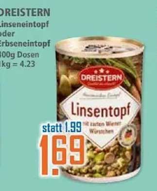 Entdecken Sie unseren köstlichen DREI-STERN Linseneintopf oder Erbseneintopf in der praktischen 400g Dose zum unwiderstehlichen Preis. Für kreative Kochtage und gemütliche Abende ist dieses Angebot genau das Richtige. Die Eintöpfe sind nicht nur geschmacklich ein Genuss, sondern bieten auch eine ideale Grundlage für abwechslungsreiche Mahlzeiten. Ob pur genossen oder mit Brot serviert – diese Eintöpfe sind ein absolutes Must-Have für jede Haushaltsküche.