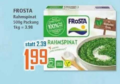 Aktuell können Sie den FROSTA Rahmspinat zum sensationellen Preis von nur 1,99€ statt 2,39€ erwerben. Dies bedeutet eine Ersparnis von 40 Cent und macht dieses Angebot zu einer ausgezeichneten Gelegenheit, gesunde Ernährung zu einem günstigen Preis zu genießen.