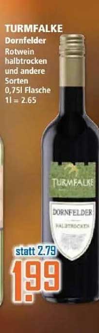 Regulär kostet die Flasche TURMfalke Dornfelder 2,79 €. Dank dieser Sonderaktion erhalten Sie ihn jetzt für nur 1,99 €. Das bedeutet für Sie eine Ersparnis von 0,80 € – das ist eine hervorragende Gelegenheit, sich diesen köstlichen Wein zu sichern!
