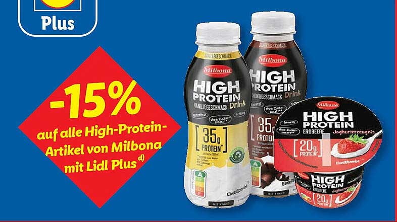 Sehen Sie sich jetzt das 15% Rabatt auf alle High-Protein-Artikel von Milbona Angebot im Lidl Prospekt an. Dieses Angebot ist gültig von 29.09.2025 bis 04.10.2025.