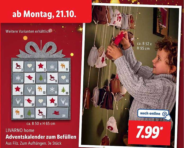 Sehen Sie sich jetzt das Adventskalender zum Befüllen Angebot im Lidl Prospekt an. Dieses Angebot ist gültig von 21.10.2024 bis 26.10.2024.