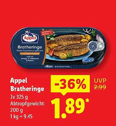 Sehen Sie sich jetzt das Appel Bratheringe 325 g - Jetzt für nur 1,89€! Angebot im Lidl Prospekt an. Dieses Angebot ist gültig von 27.10.2025 bis 01.11.2025.
