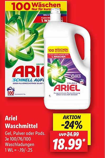 Entdecken Sie das großartige Ariel Waschmittel Angebot im neuesten Lidl Prospekt. Neben diesem Angebot finden Sie noch viele weitere attraktive Rabatte. Sie können das Ariel Waschmittel einfach online über die Lidl Website bestellen oder in einem Geschäft in Ihrer Nähe kaufen.