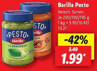 Sehen Sie sich das Barilla Pesto Angebot bei Lidl an! Dieses fantastische Angebot ist jetzt im neuesten Lidl Prospekt verfügbar. Nutzen Sie diese Chance und sparen Sie viel bei Ihrem Einkauf.