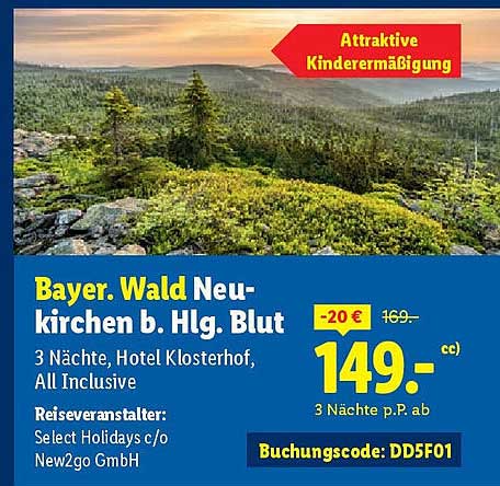 Sehen Sie sich jetzt das Bayer. Wald Neunkirchen b. Hlg. Blut - 3 Nächte im Hotel Klosterhof, All Inclusive Angebot im Lidl Prospekt an. Dieses Angebot ist gültig von 22.09.2025 bis 28.09.2025.